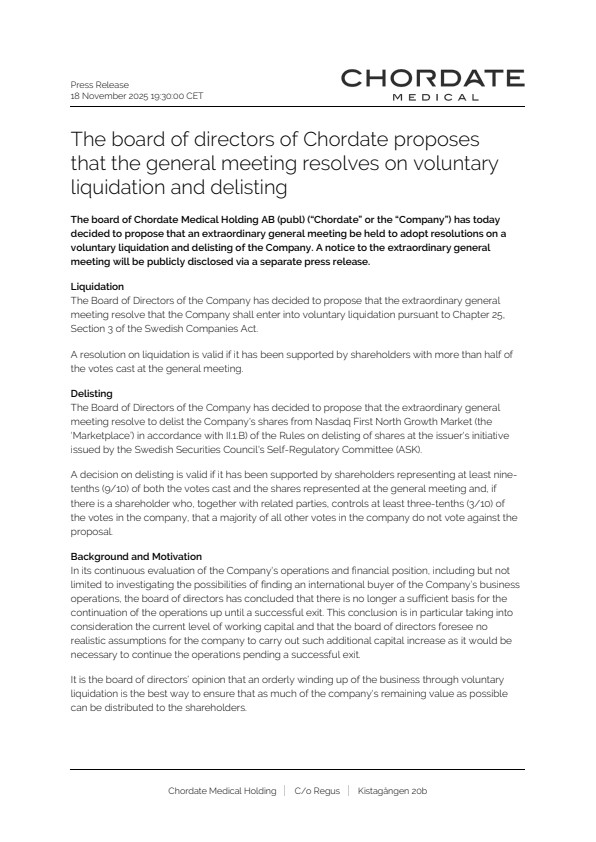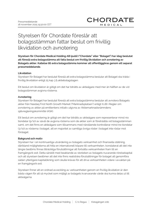The board of Chordate Medical Holding AB (publ) (“Chordate” or the “Company”) has today decided to propose that an extraordinary general meeting be held to adopt resolutions on a voluntary liquidation and delisting of the Company. A notice to the extraordinary general meeting will be publicly disclosed via a separate press release.